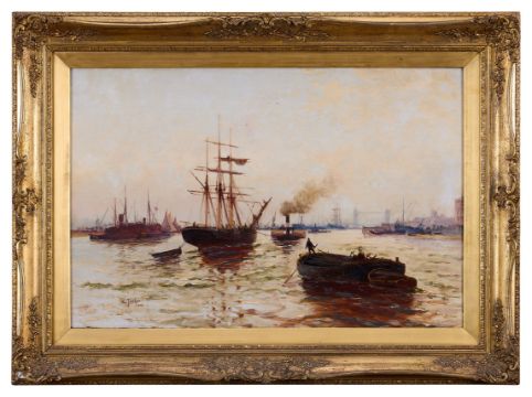 EDWARD HENRY EUGENE FLETCHER (1857-1945): SHIPPING ON THE THAMESoil on canvas, London shipping scene, with boats on the River Thames, Tower Bridge in the background, signed lower left 'E. Fletcher', in giltwood frame,the painting 76cm x 51, the frame 97cm x 71cmProvenance: Christies, London, 9th November 1995, lot 50. Sold with a copy of the original auction catalogue. With paper lot label to reverse of frame.A similar painting by Fletcher also with Tower Bridge in the background was sold at Christie's, London, 19 May 2009, lot 413, £1750.Fletcher was born at 27, The Grove, Hammersmith and studied at the Chelsea Art School. A successful Marine artist, he painted for a dealer by the name of Casteloni of Islington, who sold his works in America.He produced a number of paintings of the Thames, and has been compared to William Wyllie. He also painted under the name John Hayes, and is often referred to incorrectly as 'Edwin' Fletcher.