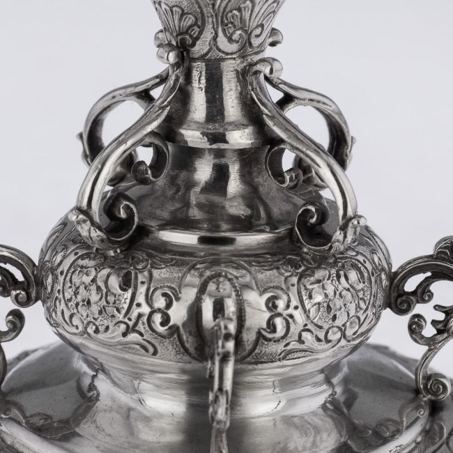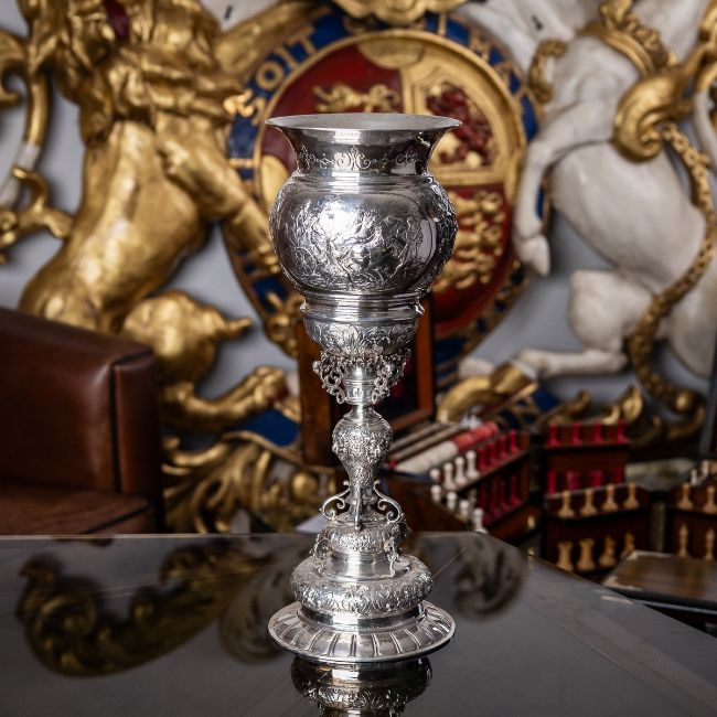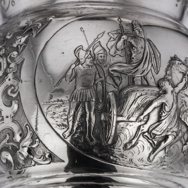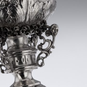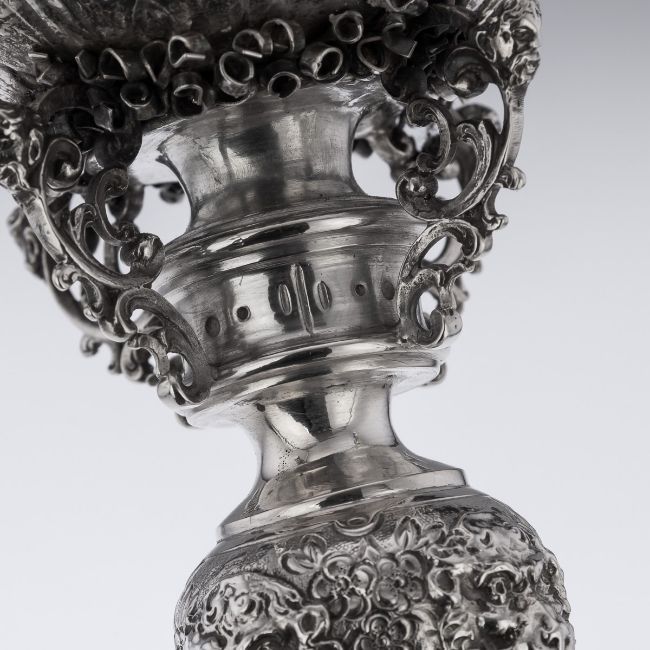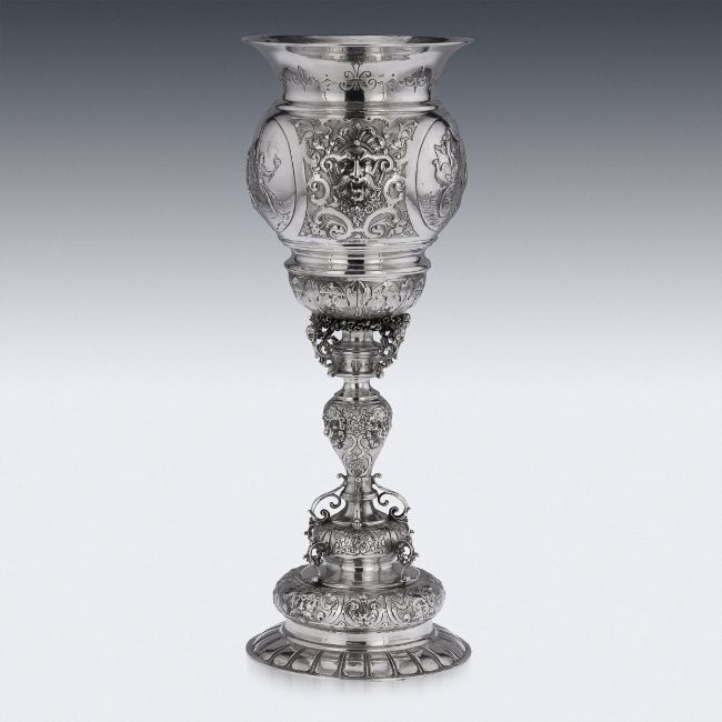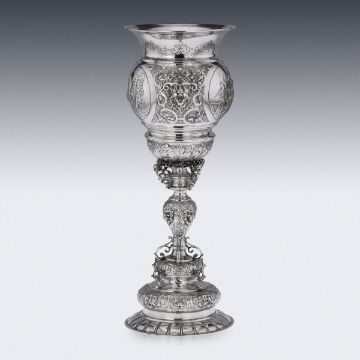 A 19TH CENTURY GERMAN SILVER WINE GOBLET, HANAU, C. 1850 Antique mid-19th Century German solid silver goblet, made in the style of the early-17th Century examples, which were originaly made in Augsburg and Nuremberg. The piece beautifully embossed with scrolling foliage, panels depicting mythological battle scenes in landscape, the foot applied with protruding lions and the cup with grotesque masks, chased floral boarders, flared rim and doomed foot, Hallmarked with the German Assay mark 13 (812 standard), used in the late 18th to mid 19th century in Prussia and Germany, possibly made by Wolf & Knell.In Great Condition - No Damage. Height: 37cm Width: 13cm Weight: 745g