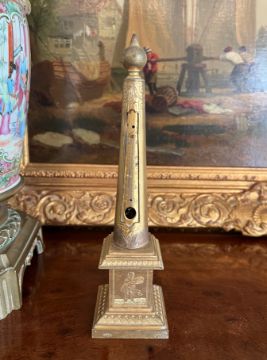 A REGENCY ORMOLU DESK THERMOMETERearly 19th century, the gilt bronze thermometer of obelisk form, the plinth base engraved with allegoriacal scenes of the four seasons, now lacking mercury tube,23cm high