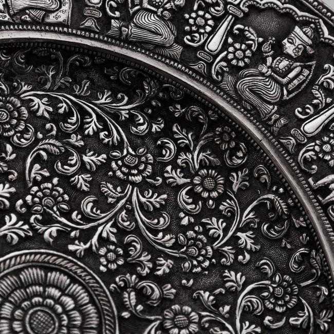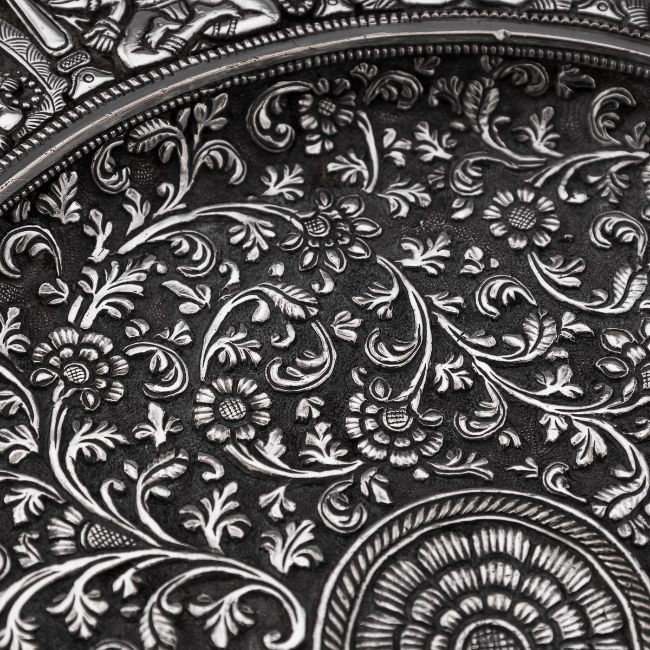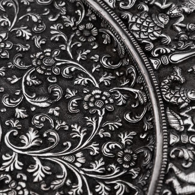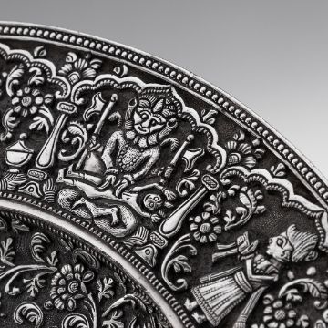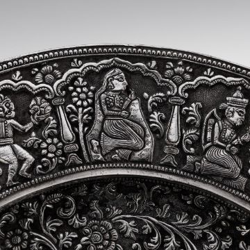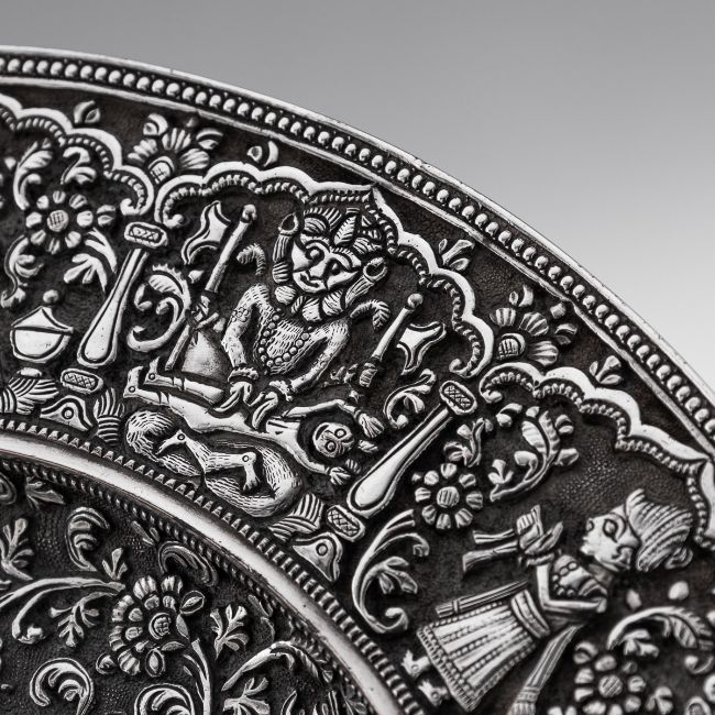 A RARE 19TH CENTURY INDIAN KUTCH TAZZA BY ELKINGTON, C. 1869silver plated, the Antique 19th Century Victorian electroplated tazza, a copy of an important piece made in India (Kutch), Bhuj, Gujarat region. On a raised base, the baluster foot spreading into a skirting of hanging palmettes to support a shallow tazza, the border decorated with medallions chased with Hindu deities, the centre finely chased with scrolling leaves and flower pattern in a finely tooled background, typical of Kutch work. Stamped on the reverse Elkington & Co, year 1869 (G), inventory number 13510CCONDITION In Great Condition - Wear expected with age Diameter: 26.5 cm // 10.43 in Height: 12 cm // 4.72 in Weight: 1070 g // 37.74 oz t's extremely rare to find such examples, which were often featured in museums and exhibitions. This piece must have originally been made by a prominent Indian silversmith or belonged to an important collection for Elkington to consider making this copy. Judging by the quality, I suspect the original piece would have the mark of "O.M BHUJ," indicating it was crafted by Oomersi Mawji, the most renowned Indian Colonial silversmith and Court Silversmith to the ruler of Kutch, Maharao Shri Mirza Raja Sawai Khengarji Bahadur, who reigned from 1875 to 1942. Oomersi Mawji's pieces are now highly sought after by collectors.