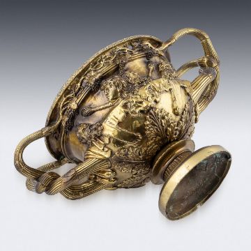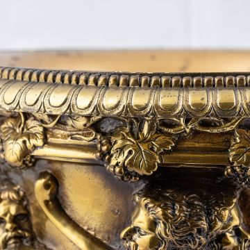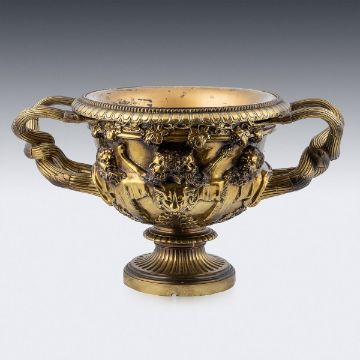 A 19TH CENTURY BRONZE MODEL OF THE WARWICK VASE, C. 1880 Antique 19th Century Victorian grand tour model of the Warwick vase. Of a typical form on a circular base, with a pedestal stem and cast throughout with masks between entwined handles. The inside of the vase with a removable liner.In Great Condition - Wear expected with age. Please refer to photographs. Height: 27 cm // 10.6 in Width: 45 cm // 17.7 in Depth: 31 cm // 12.2 in Weight: 12890 g // 28.4 lbsThe form of the vase is based on an ancient Roman marble vase with Bacchic ornament that was discovered at Hadrian's Villa, Tivoli about 1771 by Gavin Hamilton, a Scottish painter-antiquarian and art dealer in Rome and subsequently owned by George Greville, 2nd Earl of Warwick.From the second half of the 18th century onwards, excavated antique models such as the Warwick-vase were copied and adapted to the taste of the time by employing different materials such as antique marbles, alabaster, silver or bronze.