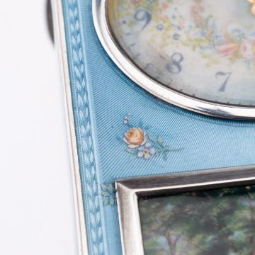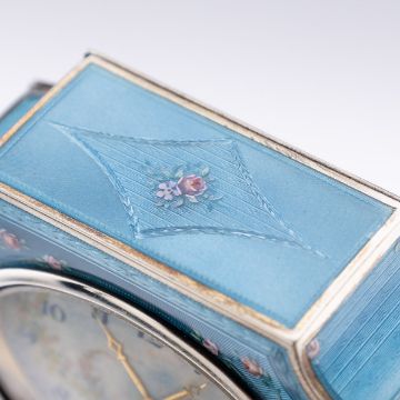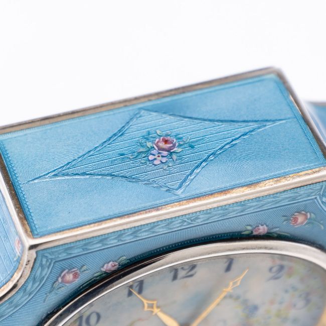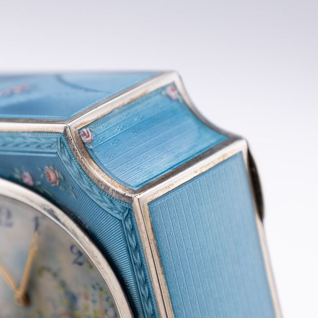 A FINE EARLY 20TH CENTURY SWISS SILVER AND GUILLOCHE ENAMEL TRAVEL CLOCK IN DISPLAY CASEthe Antique travel clock or boudoir clock, in neoclassical taste, of upright rectangular form with inverted arched top and standing on a raised grey agate plinth, applied with a translucent light blue enamel over engine-turned ground and acanthus leaf boarders, corners and sides hand painted with rose flowers, the large front plaque hand painted with a view of the Swiss alps, the white enamel dial within a bound plain bezel, the back with a flip down lid and a winding key and reeded time-adjuster, it comes in its original leather bound box. Hallmarked Swiss silver (935 standard), circa 1900, Swiss, Geneve, inventory number 58778, probably made by the GENEVA CLOCK CO.Height: 18cm Width: 10 x 5.5cm Weight: 1085gIn Excellent Condition - No Damage.