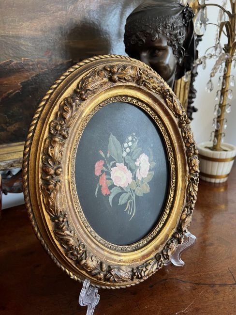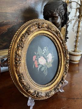 A 19TH CENTURY ITALIAN PIETRE DURE PANEL OF FLOWERSthe oval pietra dura panel depicting roses and carnations on a black ground, in later gilt frame, the panel 28cm high