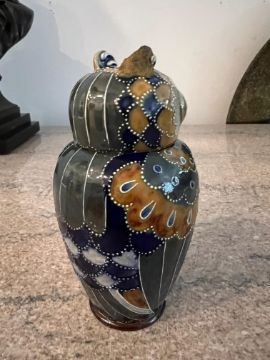 A RARE DOULTON LAMBETH OWL JAR AND COVER DESIGNED BY MARK MARSHALLcirca 1905, the tobacco jar with removable head and tube-lined feathers, impressed factory mark to underside 'Doulton Lambeth England' and numbered 1621,16cm high
