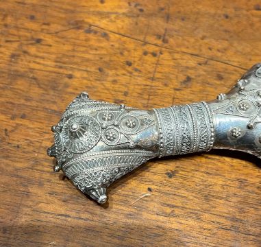 A LATE 19TH / EARLY 20TH CENTURY OMANI JAMBIYA (DAGGER)with sharply curved blade with raised medial ridge, characteristic silver coloured white metal (unmarked) hilt finely decorated with flower heads and geometric bands in filigree work, contained in its Al bu Said form scabbard decorated to match with the addition of six silver mounting rings,26cm in length