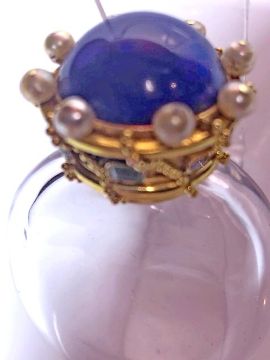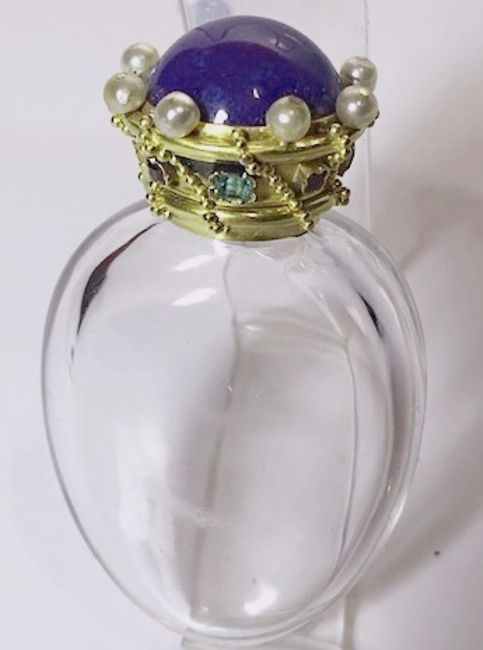 AN EARLY 19TH CENTURY FRENCH ROCK CRYSTAL SCENT BOTTLE C.1820the Antique gem-set and gold perfume flacon designed with rock crystal amphora, the hinged gold cap set with a round lapis cabochon, ringed by pearls, and eight rectangular-cut rubies and emeralds; with french Import mark.7.5cm high x 4cm Good condition.