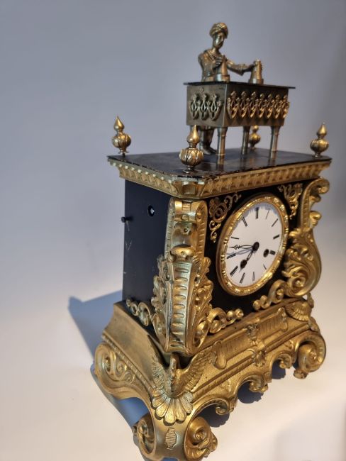 A RARE MID 19TH CENTURY AUTOMATA NOVELTY MYSTERY MAGICIAN CLOCKthe case surmounted by a brass automaton figure of a magician who moves his arms and bows, in front of him a table, cups and different objects such as dice and a bun, raised on a gilt bronze Neo-Gothic style base fitted with the clock movement, with white enamelled dial with Roman numerals and eight day clock movement with silk suspension, the inside of the case stamped 'BOUCHER FILS CHANDEY',41cm high x 30cm wide x 18cm deep