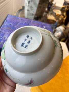 A FINE CHINESE FAMILLE ROSE PORCELAIN BOWLthe exterior and interior decorated with strawberry plants and butterflies, on a white ground, on a circular foot with six character guangxu mark in underglaze blue, in later purpose made display case,The bowl 17.7cm diameter x 7cm highGood condition
