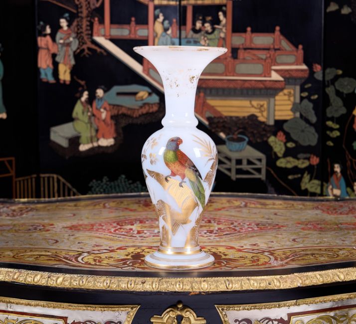 ATTRIBUTED TO BACCARAT: A RARE MID 19TH CENTURY OPALINE GLASS VASE DECORATED WITH EXOTIC BIRDSPROBABLY PAINTED BY JEAN-FRANCOIS ROBERT, CIRCA 1845-55the white opaline glass vase of baluster form with elongated neck and everted lip, raised on a circular foot, the foot and lip with gilt decoration, the body finely painted in enamels, depicting exotic birds such as parrots amongst foliage,35cm highFootnote:Jean-Francois Robert developed a technique for painting glass in the 1830s and patented the process. He was a painter at the Sevres porcelain factory, before setting up his own workshop in Sevres, where he was employed by both Baccarat and St Louis to paint their fine glass.