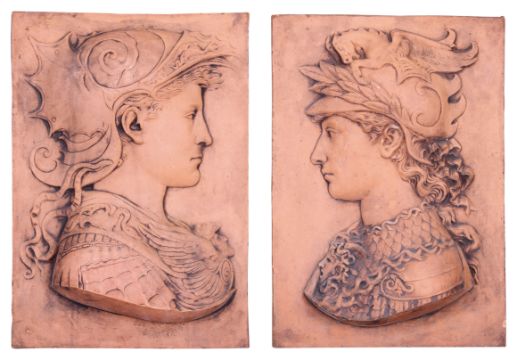A PAIR OF RENAISSANCE STYLE TERRACOTTA RELIEFS OF ROMAN SOLDIERSthe profile portraits depicting the classical figures facing left and right, each in an ornate helmet, fitted with hanging rings for wall hanging to the reverse,33cm x 47cm (2)