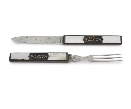 AN 18TH CENTURY TRAVELLING KNIFE AND FORK SEThorn, steel and mother of pearl, with inlaid pique work to the handles, the utensil ends fit into each other's handle, the blade marked 'BILBO*', 18.5cm in length