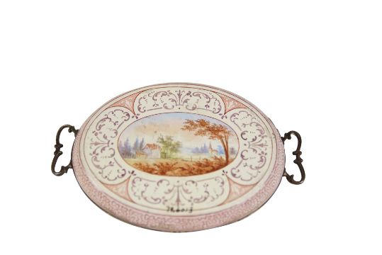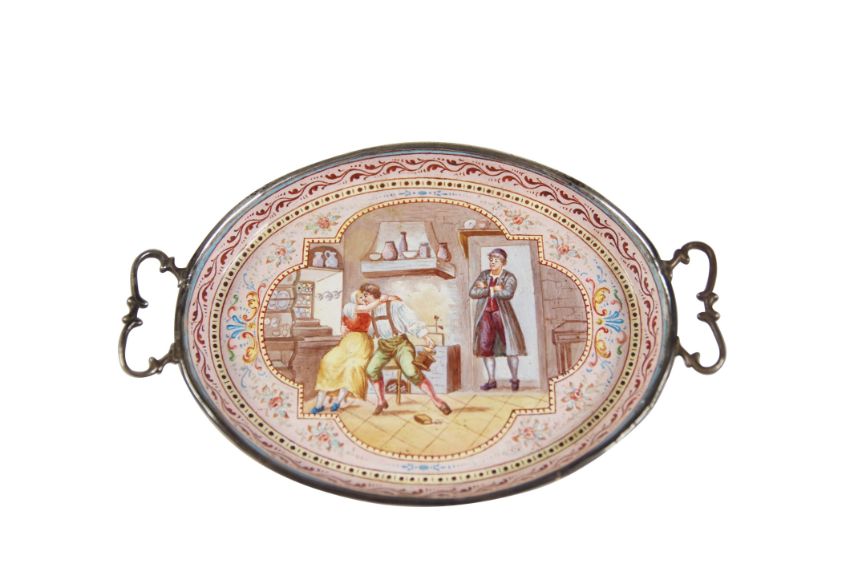 A 19TH CENTURY VIENNESE SILVER AND ENAMEL TRAY C.1880 BY LUDWIG POLITZERon a pale pink background with a courting couple surprised by an angry father whilst kissing in the kitchen by Ludwig Politzer.Good condition.