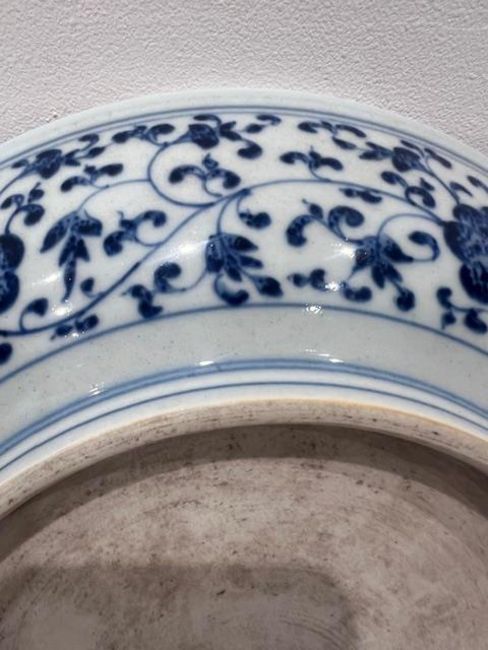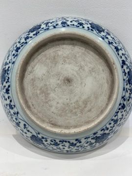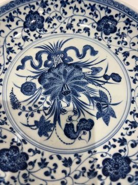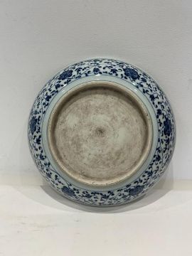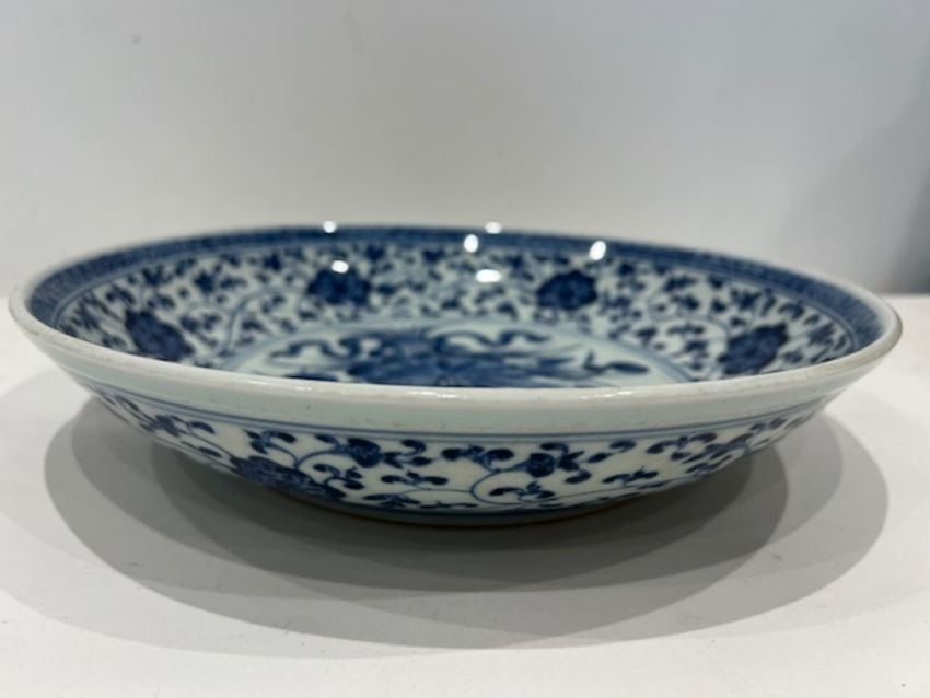AN 18TH CENTURY CHINESE YONGZHENG PORCELAIN DISHthe circular blue and white plate decorated with a lotus flanked by a border of scrolling tendrils, unmarked,29cm high