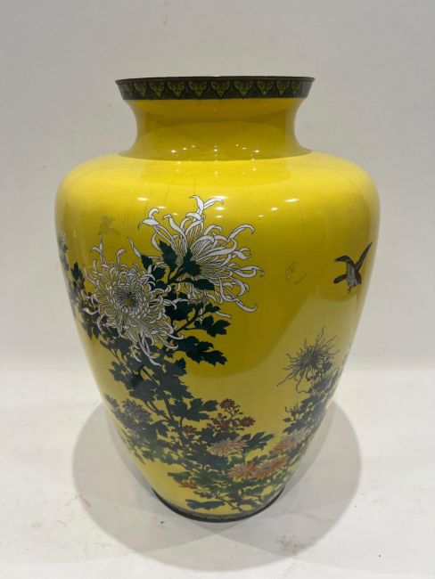 A MASSIVE LATE 19TH CENTURY CHINESE YELLOW CLOISONNE ENAMEL VASEdecorated with chrysanthemum and other flowers and birds, of baluster form,47cm high