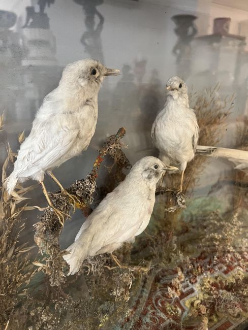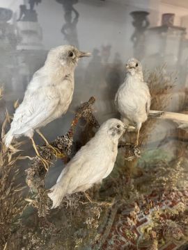 A RARE 19TH CENTURY TAXIDERMY STUDY OF AN ALBINO PHEASANT AND BLACKBIRDSthe cased display in the manner of Roland Ward, comprised of a white or leucistic pheasant, with three albino blackbirds beside her mounted to resemble chicks, in an ebonised and glazed rectangular display case,the case 75cm wide x 46cm high