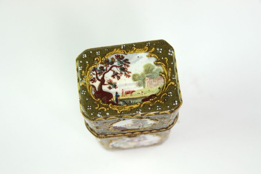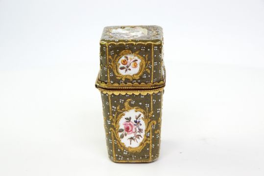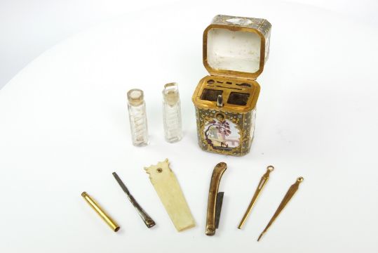 A LATE 18TH CENTURY ENGLISH ENAMEL SCENT NECESSAIRE C.1780,containing two scent bottles, a slip for writing, a pen knife, and a needle, and a tapestry aid.7 x 4cm Good condition.
