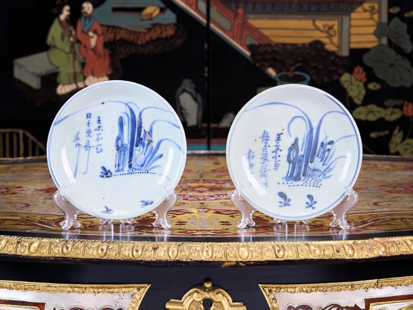 A PAIR OF SWATOW WARE PORCELAIN DISHESChinese, probably Ming Dynasty, early 17th century, the blue and white dishes decorated with design of orchids and leaves with inscriptions,16cm diameter