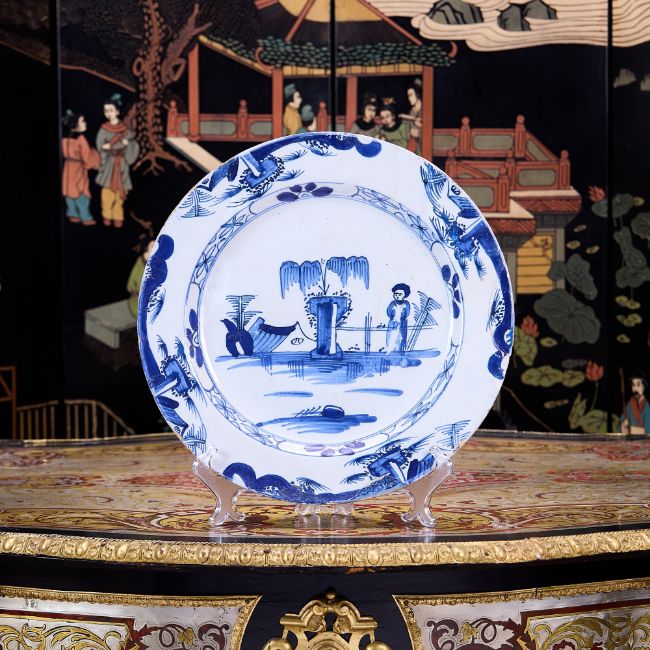 A LARGE 18TH CENTURY BLUE AND WHITE CHARGER, POSSIBLY BRISTOLthe tin glazed earthenware plate of circular form, decorated with a centra figure and tree, restored,35cm diameter