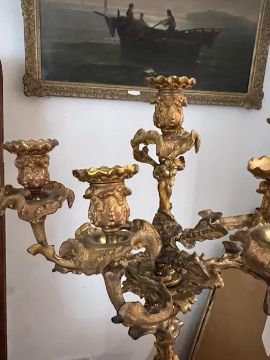A PAIR OF LARGE AND IMPRESSIVE 19TH CENTURY GILT BRONZE CANDELABRAthe triform bases decorated in relief with saints, on three scroll feet, the stems cast with grapes and vines and issuing five scrolling branches,75cm high (2)