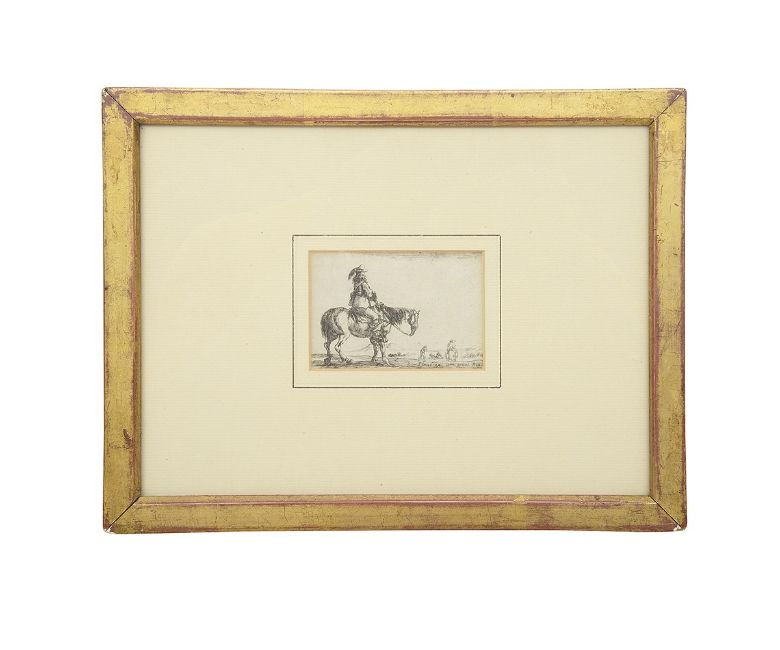 A 17TH CENTURY ITALIAN ETCHING 'CAVALIER ON HORSEBACK'with further figures in the background, later framed, uninspected out of frame,the print 8cm x 6cmA similar etching of the same scene by Della Bella is in the New York Public Library.