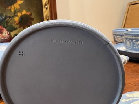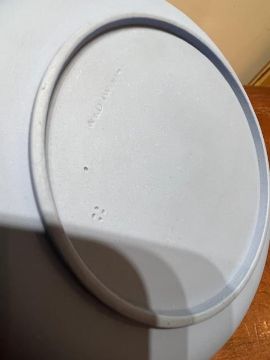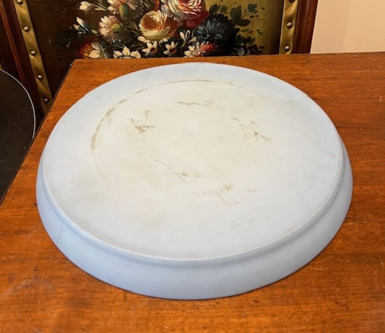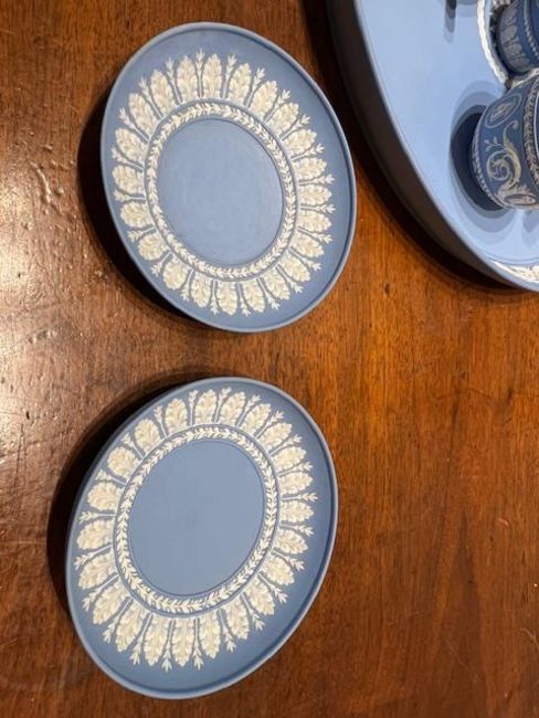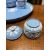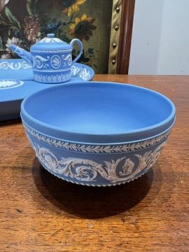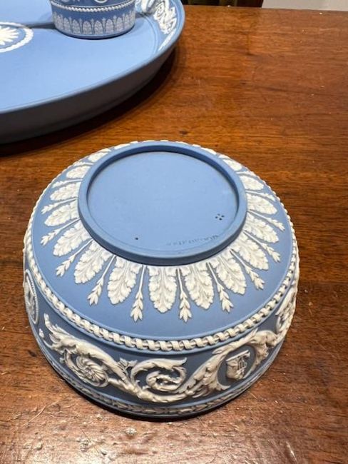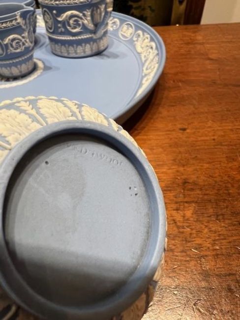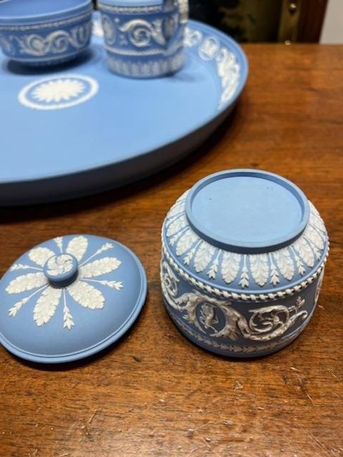 WEDGWOOD: A RARE JASPERWARE NEO-CLASSICAL STYLE CABARET SETthe tea set comprising teapot, milk jug, sucrier and cover, slops bowl, two cups and saucers and a circular matching tray, all sprigged in white on a blue ground, with impressed marks,the tray 39cm diameter (9)Good condition throughout.