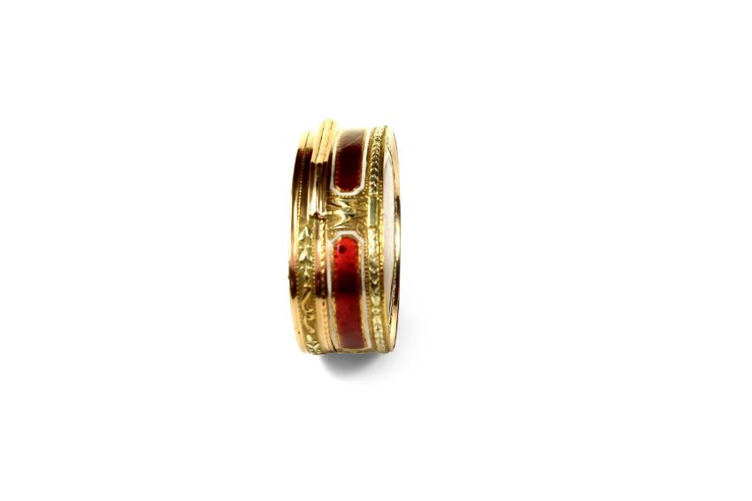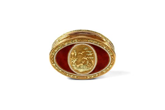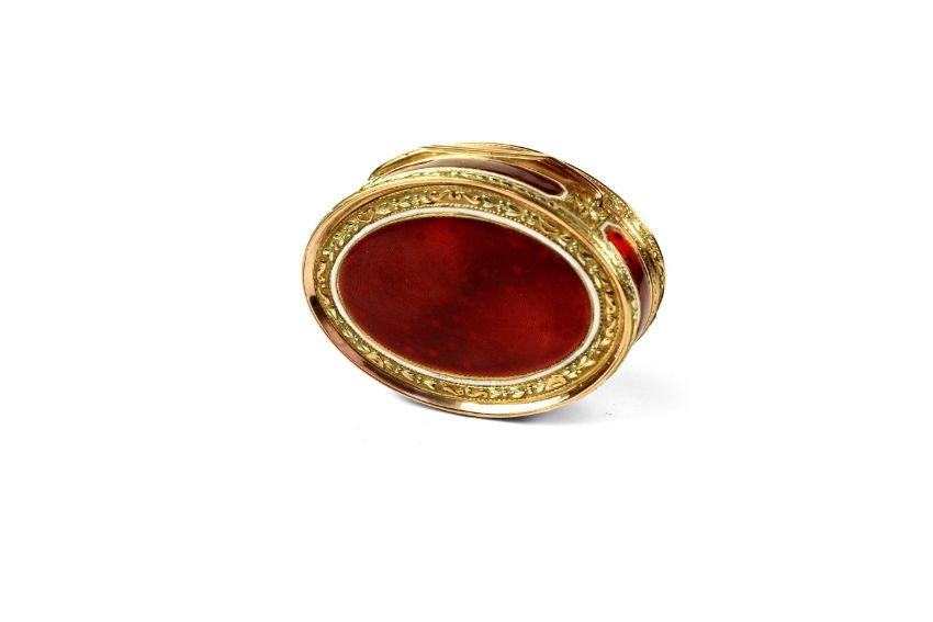 AN 18TH CENTURY FRENCH GOLD AND ENAMEL SNUFF BOX C.1780a good three colour oval gold and enamel snuff box enameled in Red over engine turning with white borders with a central three colour gold plaque depicting a dog barking at birds stealing eggs from an over turned basket the sides with four gold and enameled panels the base enamelled in red with white borders the interior with the makers mark of Jean Charles Marie Boudou Paris 1783 on the base lid and the central base sides7cm x 5.5cm Good condition.