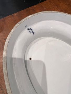 MEISSEN: A 19TH CENTURY PORCELAIN STANDof oval form, decorated with hanging garlands and a Vitruvian scoll border, with crossed swords mark,28cm wide