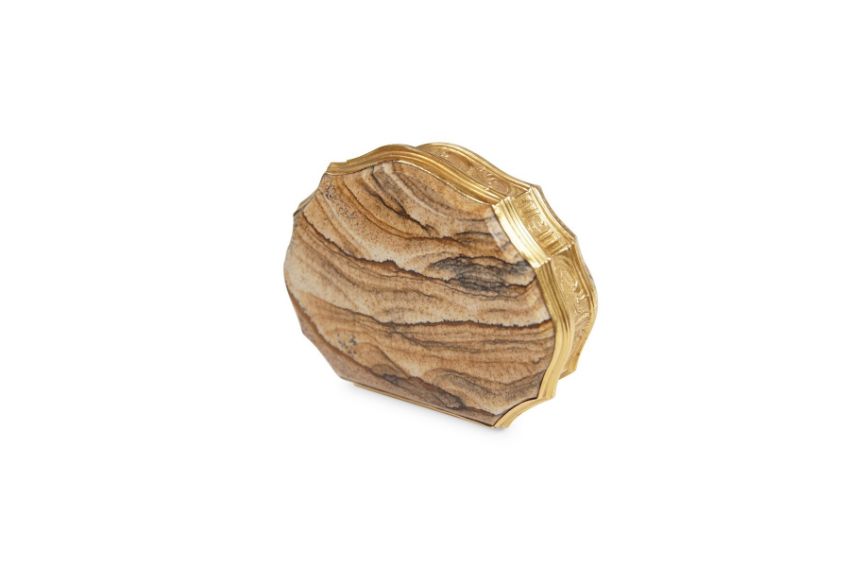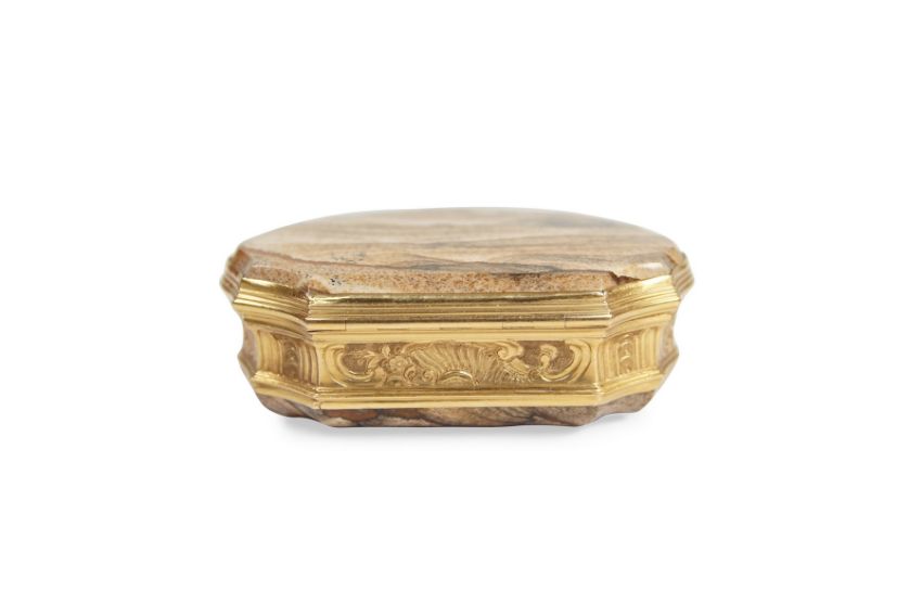 A LATE 18TH / EARLY 19TH CENTURY ENGLISH GOLD MOUNTED AGATE BOX CIRCA 1800the cartouche shaped snuff box with hinged coverGood condition.