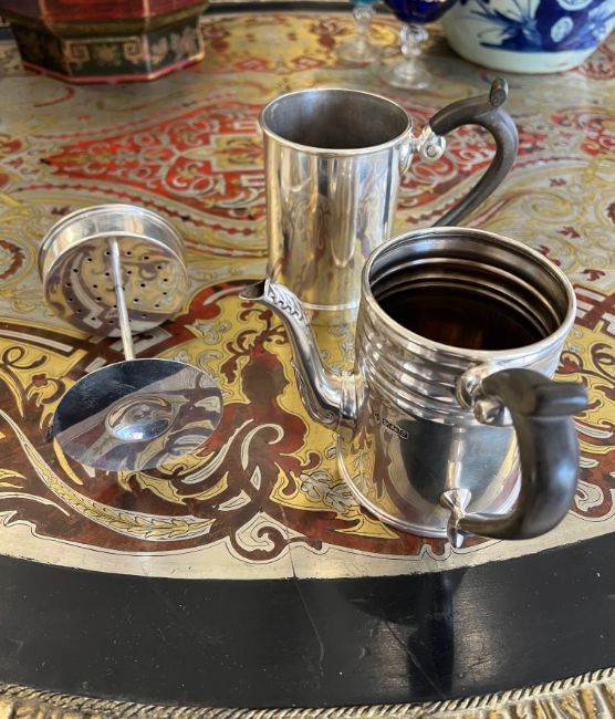 A RARE EARLY 20TH CENTURY ENGLISH STERLING SILVER COFFEE PERCOLATOR C. 1906the Edwardian antique silver coffee pot formed of two sections, the upper removable section with plunger and sieve at the base, above the lower section with spout, both with scrolling wooden handles, both hallmarked Sheffield, 1906, maker's mark for Martin, Hall & Co (Richard Martin & Ebenezer Hall), 700 grams (22.50 ozt) in weight,25cm high