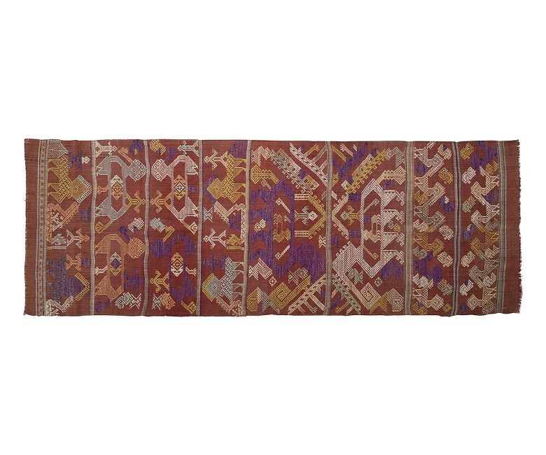 AN 18TH CENTURY CAMBODIAN SILK SHAWLdecoarted with stylised figures on a red ground,122cm x 42cm
