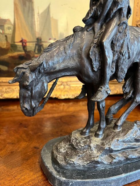 AFTER JAMES EARL FRASER: 'THE END OF THE TRAIL'the bronze figure of a native American Indian on horseback, on naturalistic base, raised on a marble plinth35cm high overall