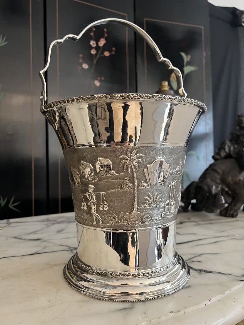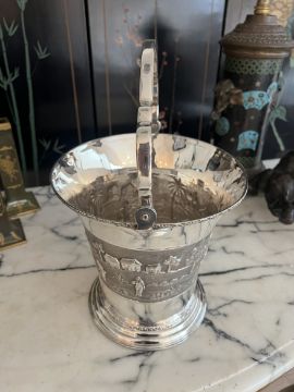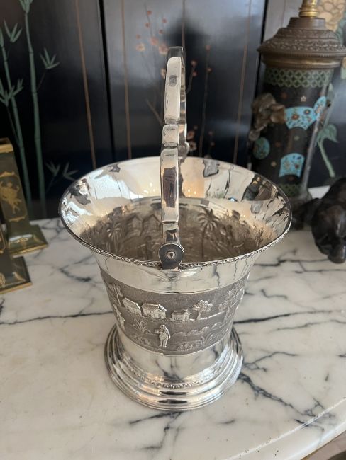 AN INDIAN SILVER ICE BUCKETthe ice bucket or wine / champagane cooler of tapering form on a circular foot, with shaped swing handle over, the body with a chased band depicting figures and elephants in a landscape, marked to the underside 'SILVER', 1315 grams (42.27 oz t.)36cm high handle upGood condition.