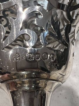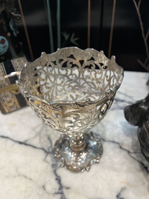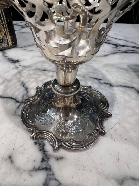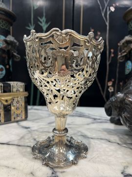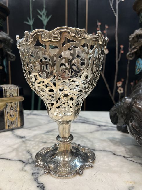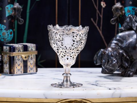A FINE MID 19TH CENTURY STERLING SILVER PIERCED PEDESTAL BOWL C. 1851, LONDONthe English Victorian silver cup or bowl in the Rococo style, the pierced body with central cartouche and with acanthus C scroll rim, raised on a knopped foot and scrolling base, hallmarked London, 1851, maker's mark for Joseph & Albert Savory, 370 grams19cm high