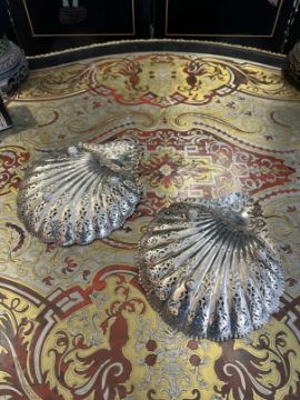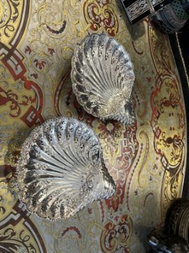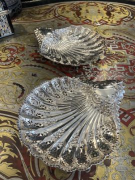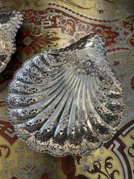 A PAIR OF EARLY 20TH CENTURY STERLING SILVER SHELL SHAPED DISHES C. 1908Edwardian period, the pierced dishes formed in the shape of shells, with Rococo style decoration, raised on three feet, hallmarked Sheffield, 1908, maker's mark for Atkins Brothers, 430 grams in weight overall,24cm wide (2)