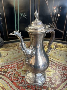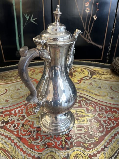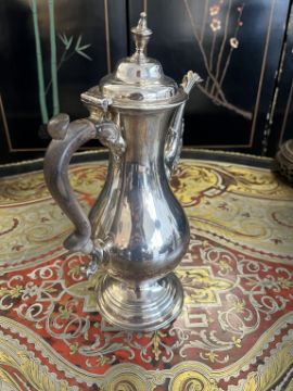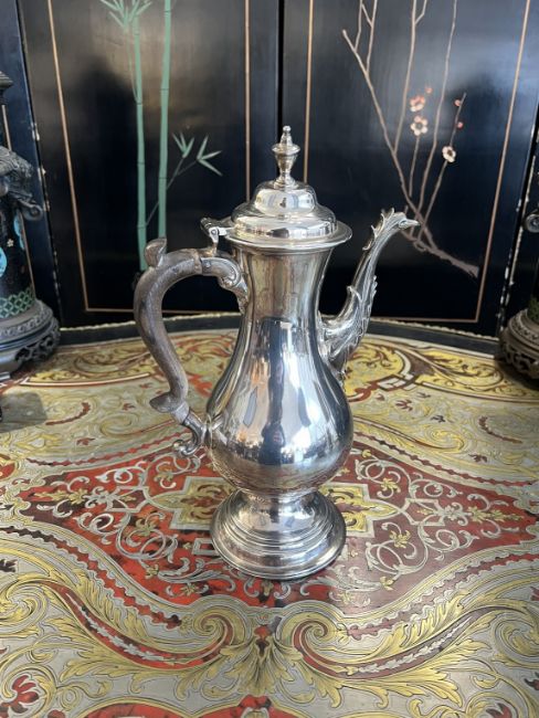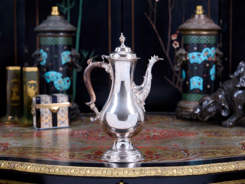 A GEORGE III PERIOD STERLING SILVER COFFEE POT C. 1780, MAKER'S MARK FOR GEORGE SMITH IIthe 18th century silver coffee pot with hinged cover surmounted by urn shaped finial, the acanthus warpped spout with finned decoration to the top, with wooden scrolling handle and raised on a domed circular foot, hallmarked to the underside London, 1780, maker's mark for George Smith (II),845 grams (27 oz t.) in weight overall31cm high