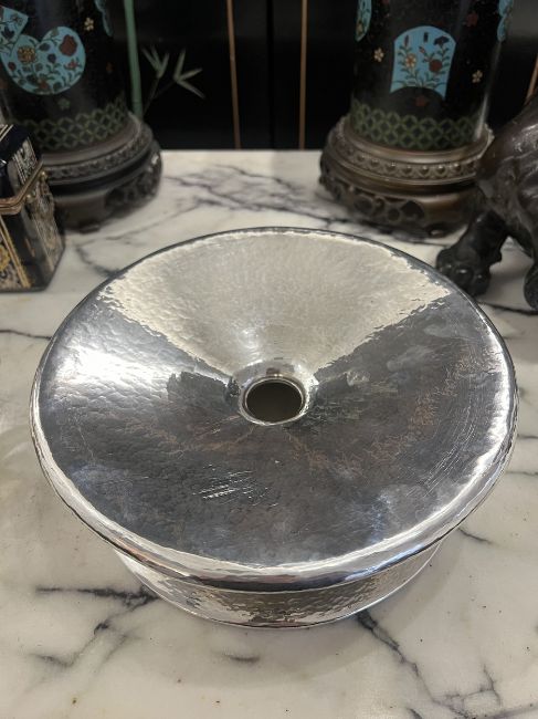A STERLING SILVER CENTREPIECE, LONDON, 1976the Elizabeth II Modernist centrepiece or candelabra of circular form with two tiers, the upper tier with three candle nozzles and multiple stylised leaves, with planished surface, hallmarked London, 1976, maker's mark PTM, 1055 grams (33.91 oz t) in weight,23cm diameter x 10.5cm high