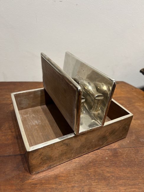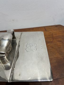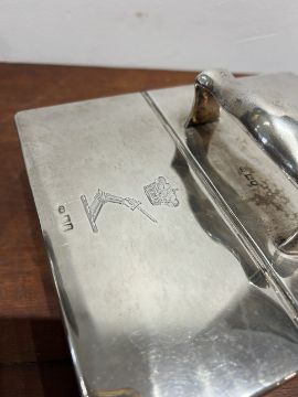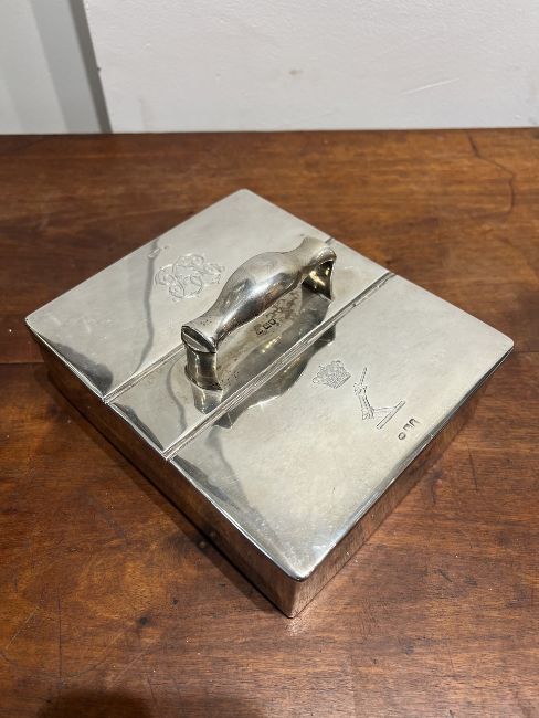 AN EARLY 20TH CENTURY STERLING SILVER HUMIDOR ENGRAVED WITH AN EARL'S CORONET, C. 1902the Edwardian cigar bow with a pair of hinged covers, one engraved with initials the other with an earl's coronet and heraldic crest possibly for Earl Poulett (1883-1918), centred by a handle, the interior cedar wood lined, hallmarked London, 1902, maker's mark for Joseph Braham, overall weight 1495 grams,20cm x 17cm