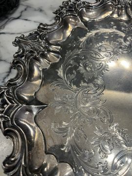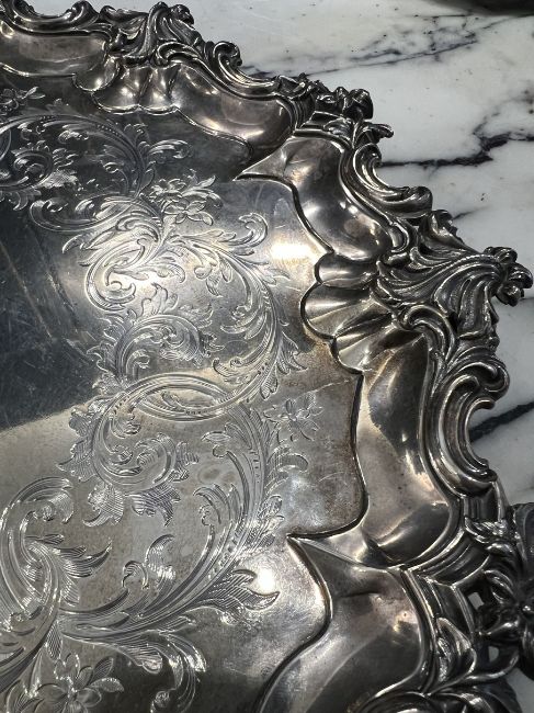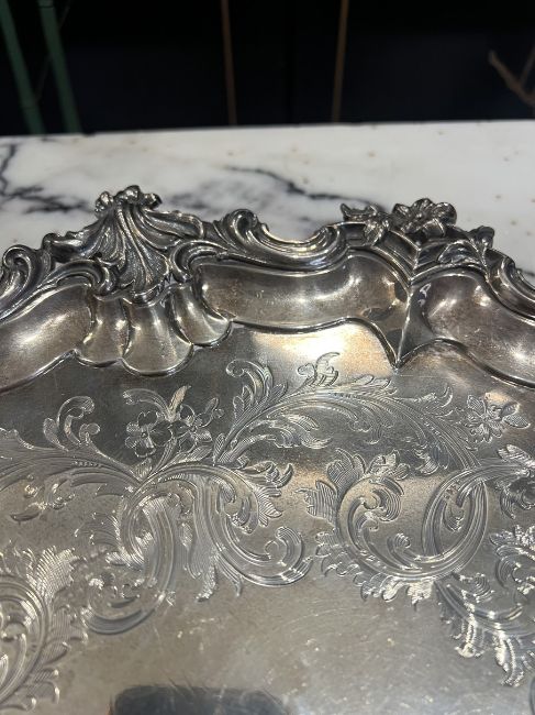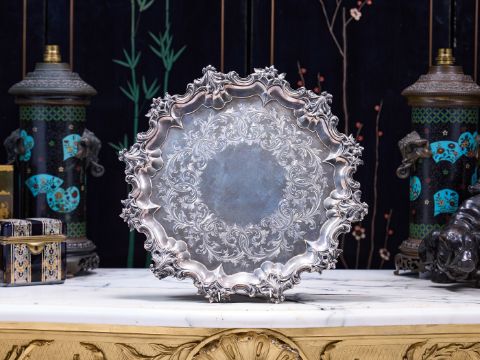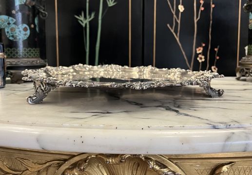 A MID 19TH CENTURY STERLING SILVER TRAY C.1856, EDWARD & JOHN BARNARDof Rococo style, raised on three acanthus scroll feet, of shaped circular outline with C scroll, flower and foliate rim, the centre with engraved decoration of strapwork and scrolls, hallmarked London, 1856, maker's mark for Edward & John Barnard, also numbered 205,1535 grams (49.35 oz t. )40cm wide