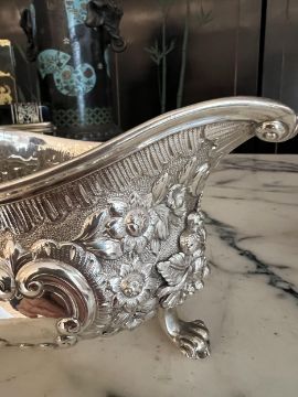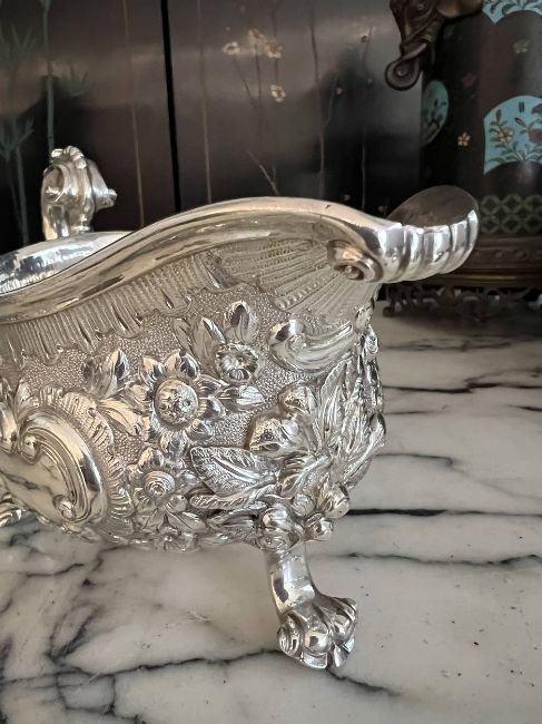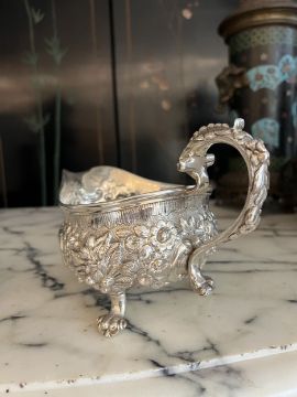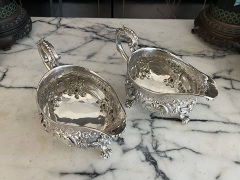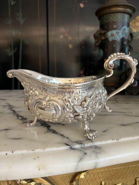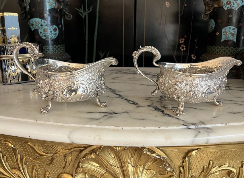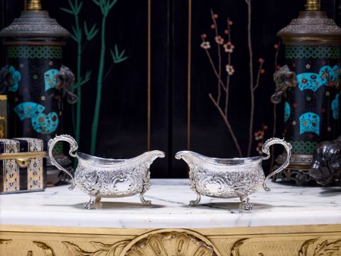 A PAIR OF EARLY 19TH CENTURY STERLING SILVER SAUCE BOATS C. 1820, WILLIAM FOUNTAINthe George IV period English silver jugs designed in the Rococo style of the George II period, raised on three paw feet, with scrolling, acanthus wrapped handles, the bodies with C scrolls, flowers and foliage, the undersides hallmarked London, 1820, maker's mark for William Fountain,1280 grams (41.15 oz t.) in weight overall22cm wide x 13cm high (2)In good condition.
