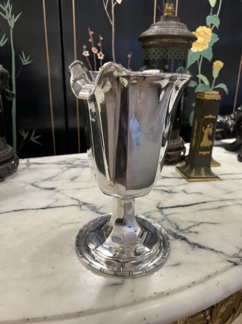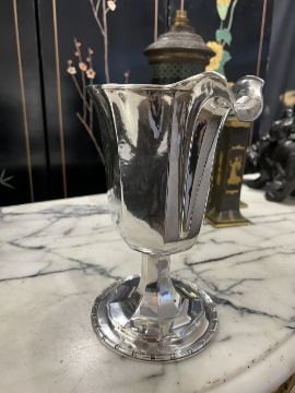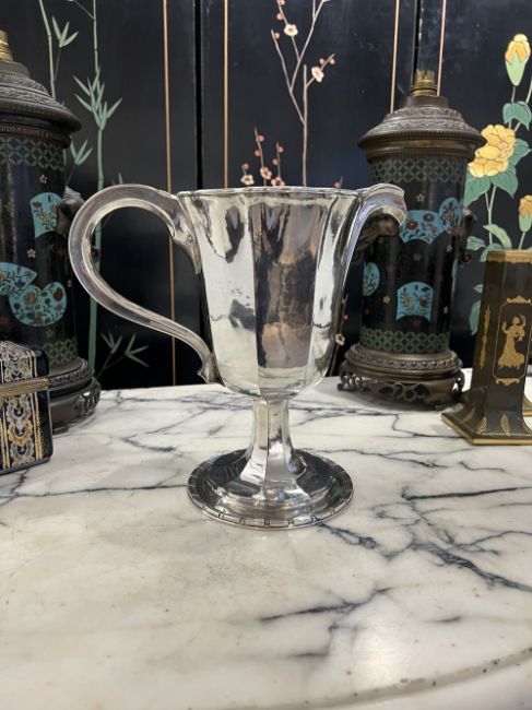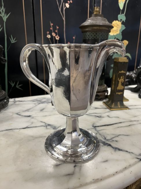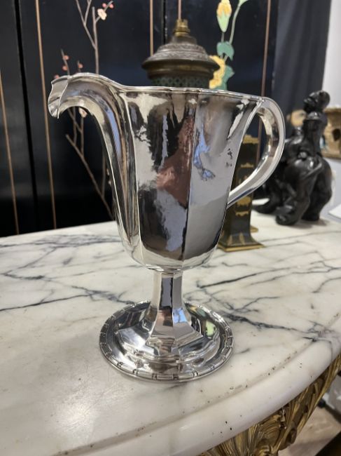 OMAR RAMSDEN C. 1932: A LARGE STERLING SILVER JUGThe early 20th century silver water or cocktail pitcher in the Arts and Crafts style, with faceted body and scroll handle, raised on a faceted spreading foot with dentil border, hallmarked London, 1932, OR, the underside signed 'OMAR RAMSDEN ME FECIT' Approx. Weight - 1482g / 47.65oz Approx. Height - 25.3cm Approx. Width incl handle - 26.4cm Approx Depth - 14.5cmThis Silver Jug is in excellent condition with no damage.