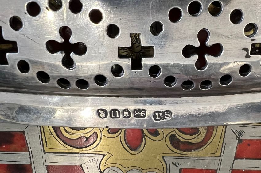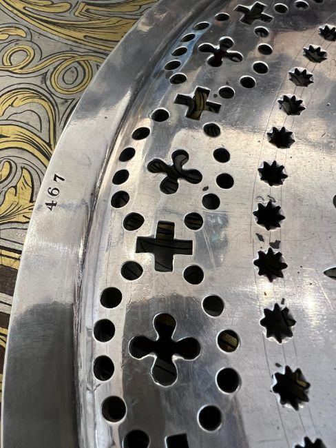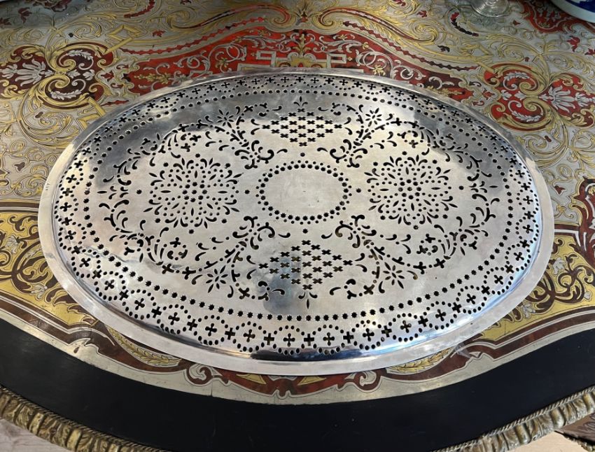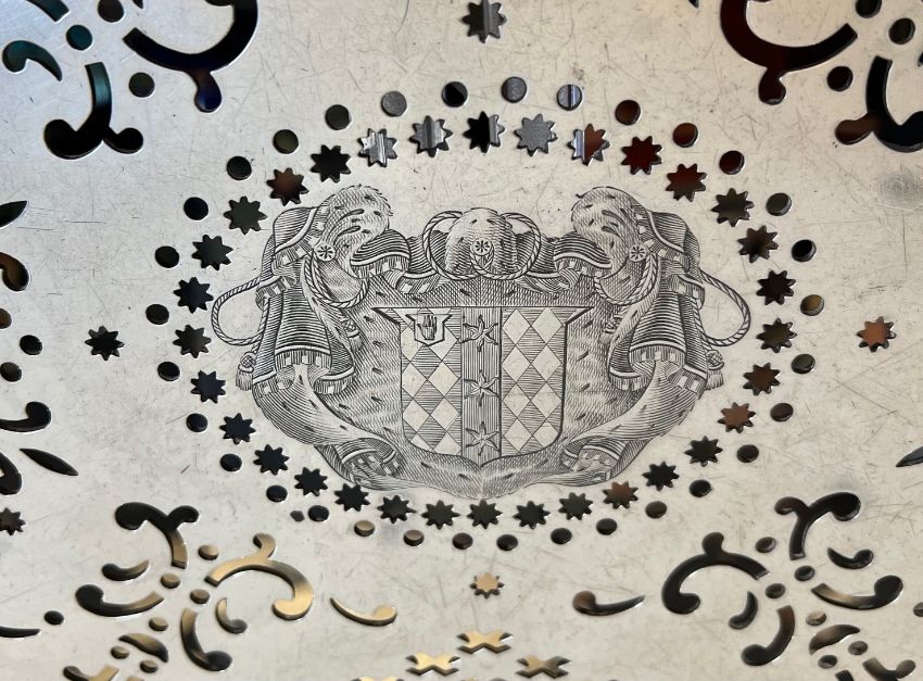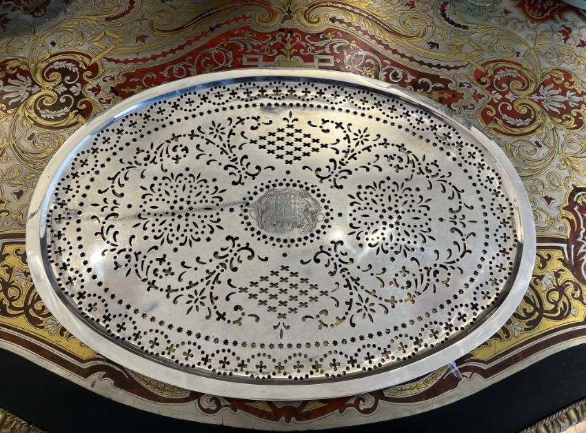 PAUL STORR: A REGENCY STERLING SILVER MAZARINE, LONDON, 1815the early 19th century English Georgian silver meat carving tray of oval form with pierced decoration of scrolls, crosses, circles and stars in a geometric design, centred by an heraldic crest, hallmarked to underside London, 1815, PS, and numbered 467, 2735 grams (87.93 oz troy) in weight,57cm x 40cm