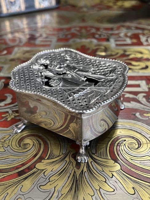 AN EARLY 20TH CENTURY STERLING SILVER BOX, C.1903Edwardian period, raised on four paw feet, with pierced top depicting an 18th century courting couple, hallmarked Birmingham, 1903, 75 grams in weight,8cm wide