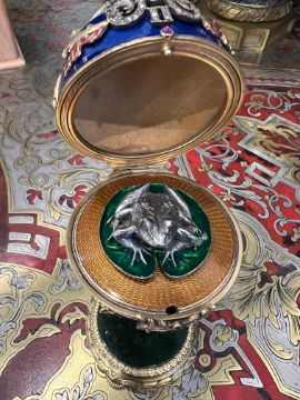 A FABERGE STYLE DIAMOND ENCRUSTED, NEPHRITE ENAMEL AND SILVER GILT SURPRISE EGGthe Russian Imperial style 'Easter Egg' with ovoid silver gilt mounted body in translucent blue, the hinged cover with a swan finial over a pierced scrolling band of diamonds, and the cypher for Nicholas II flanked by red enamel scrolls, also encrusted with diamonds and ruby coloured stones, also set with silver gilt crowns within laurel wreaths, raised on a base modelled as a pair of rampant lions, over a circular, nephrite jade base on four feet, the egg opening to a naturalistically modelled sculpture of a frog with gem set eyes raised on a green enamelled lily pad, on a yellow guilloche enamel base, bearing psuedo Faberge marks to the underside, mounted in a wooden display case, the egg 335 grams in weight overall,18cm high
