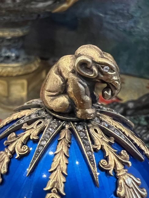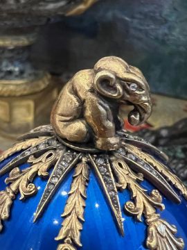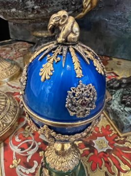 A FABERGE STYLE DIAMOND ENCRUSTED, NEPHRITE, ENAMEL AND SILVER GILT SURPRISE EGGthe Russian Imperial style 'Easter Egg' with ovoid silver gilt mounted body in translucent blue, the hinged cover with an elephant finial over a diamond encrusted star and twin headed eagle mounts, also encrusted with diamonds and ruby coloured stones, the lower section with floral garlands, on a nephrite jade plinth base with further diamond encrusted twin headed eagle, on a circular foot, the inside with a silver model of a bear with gem set eyes, playing a drum, on a fine guilloche enamel blue base, bearing psuedo Faberge marks to the underside, mounted in a wooden display case, the egg 310 grams in weight overall,18cm high