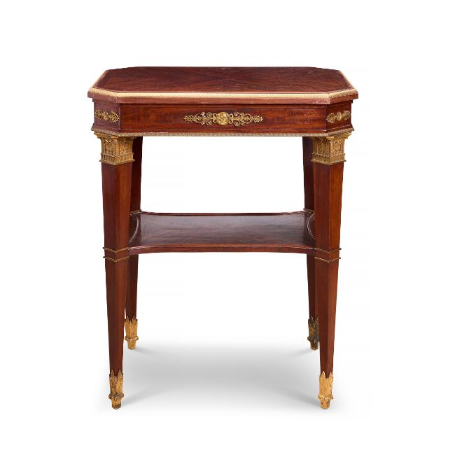 A LOUIS XVI STYLE ORMOLU MOUNTED MAHOGANY OCCASIONAL TABLEin the 18th century style, the rectangular top with canted angles over a shaped tier below, on square tapering legs with gilt bronze mounts, one foot marked 'P. Sormani', 63cm wide x 47cm deep x 73cm high