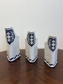 ROYAL WORCESTER: A SET OF THREE AESTHETIC STYLE PORCELAIN JUGS C. 1870the 19th century Victorian graduated set of three triangular jugs with cobalt blue decoration on a white ground, each with Royal Worcester mark and Rd design mark,the largest 22cm high