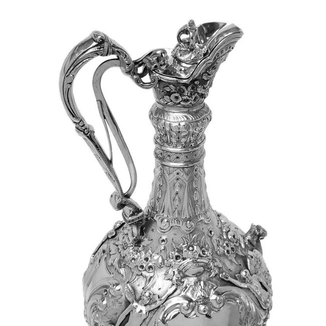 AN IMPRESSIVE PAIR OF IRISH STERLING SILVER 'ARMADA' CLARET JUGS C. 1876-1877, DUBLINthe antique Victorian 19th century wine ewers ornately decorated throughout with chased and applied detailing of mythical creatures, winged herms, floral garlands, acanthus leaves, trailing husks and c scroll cartouches, with an applied leopard head opposite the foliate wrapped, scrolling handles, the handles with a lever to open the covers, raised on circular domed and gadrooned feet, with full English Hallmark on the Jug and part marked on the lever, Dublin, 1876 & 1877, maker's mark for John Smyth, Approx. Total Weight - 2696g / 86.7ozApprox. Height Jug - 37.3cmThese Irish Armada Jugs are in excellent condition with no damage.