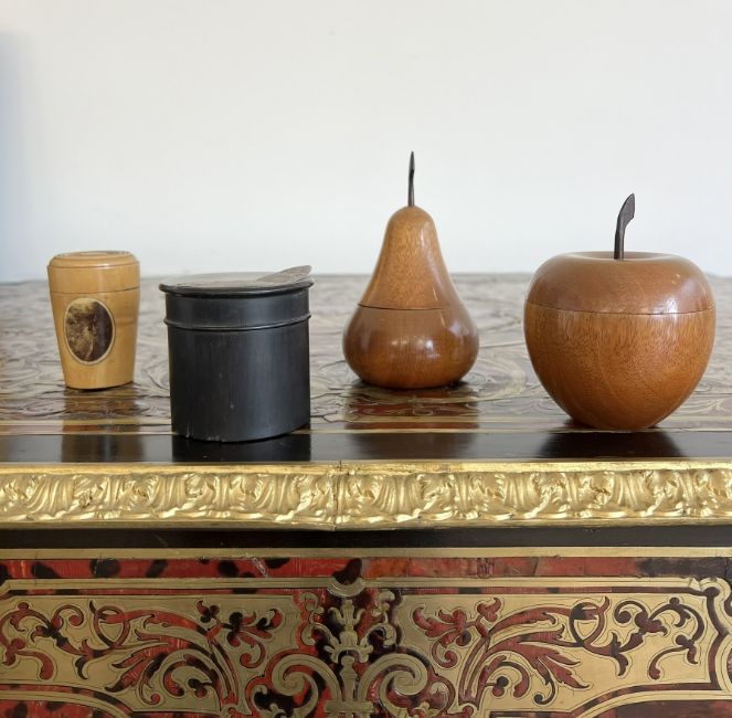 A SMALL COLLECTION OF TREENcomprising a carved wood apple tea caddy, a similar pear caddy, 20th century, a small carved wood shot glass holder and an ebony box with silver mount,the pear 14cm high (4)