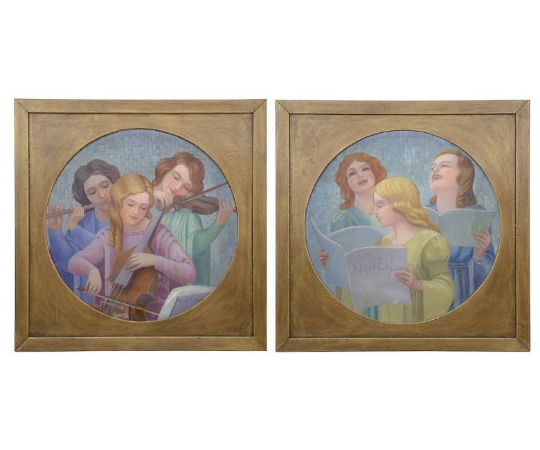 A LARGE PAIR OF 1930'S PAINTINGS OF SINGING CHILDRENoil on canvas, each depicting three girls, one painting singing, the other with musical instruments, both with mosaic style abstract backgrounds, one inscribed 'S.S. GENEVIEVE DE MONTORRE 1938', both framed,105cm x 105cm including frame (2)