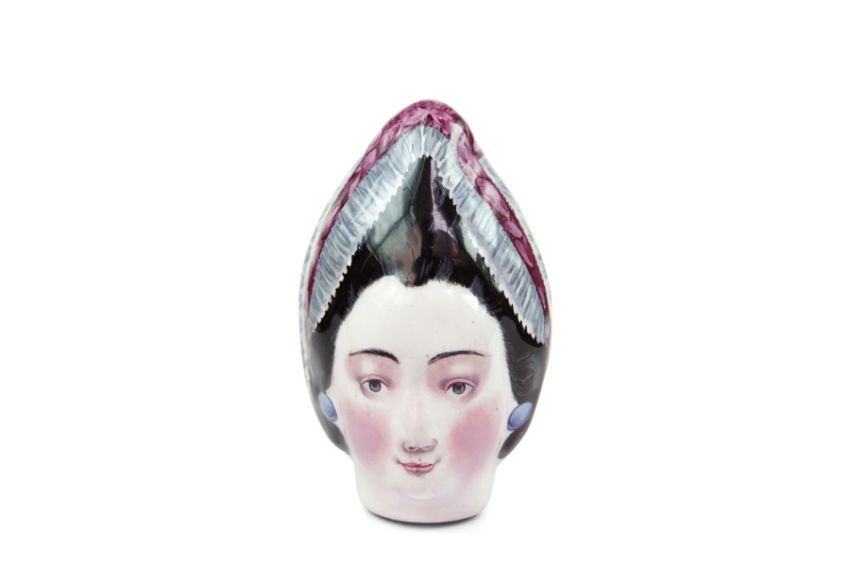 A RARE 18TH CENTURY BATTERSEA ENAMEL BONBONNIERE DEPICTING THE HEAD OF FLORA MACDONALD C. 1765-70English, George III period, Flora depicted wearing blue earrings, with heavily rouged cheeks and dark hair pulled up into a coiffured bun under a purple and grey bonnet, the verso with metal mounted hinged lid decorated as the back of her bonnet, , 8cmFlora Macdonald was born in 1722 and was famed for courageously assisting in the flight of The Young Pretender after the 1745 rebellion. South Staffordshire and Bilston enamel scent bottles depicting Flora Macdonald were also produced in this period and these appear to be based on the portrait that Flora commission from Richard Wilson which is now in the Scottish National Portrait Gallery.